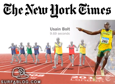 Il New York Times ha realizzato questo video che paragona tutti i tempi di Usain Bolt con quelli degli atleti saliti sul podio olimpico dal 1896 ad oggi. Il clip mostra quanto si sia spinto avanti l'uomo nella sfida dei 100 metri, confrontando i tempi di Usain Bolt con il suo 9''69 (nel 2012), Carl Lewis con il suo 9''92 (nel 1968), Jim Hines con il suo 9''95 (nel 1968) e Jesse Owens con il suo 10''3 (nel 1936).