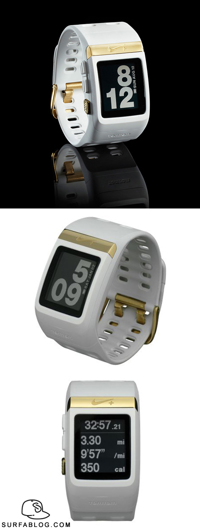 Nike+ SportWatch GPS Gold Olympic Edition. E' un'edizione speciale dell'orologio SportWatch (per saperne di più clicca qui) dedicato alla vittoria degli Stati Uniti alle Olimpiadi di Londra 2012 contenente il display LCD, il GPS con TomTom, calcolo della distanza e del battito cardiaco. Inoltre include decorazioni in oro 18 carati. Questo orologio è infatti stato offerto solo agli atleti statunitensi vincitori di una medaglia d'oro.