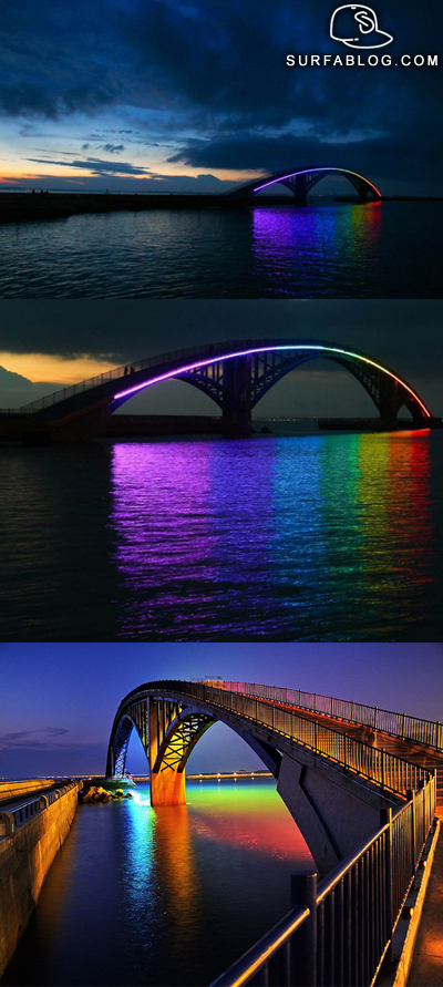 Eccovi lo Xiying Rainbow Bridge a Magong, Penghu County a Taiwan. Il ponte è sopraelevato ed è dotato di neon color arcobaleno che riflettono i le luci sulla superficie dell'acqua.