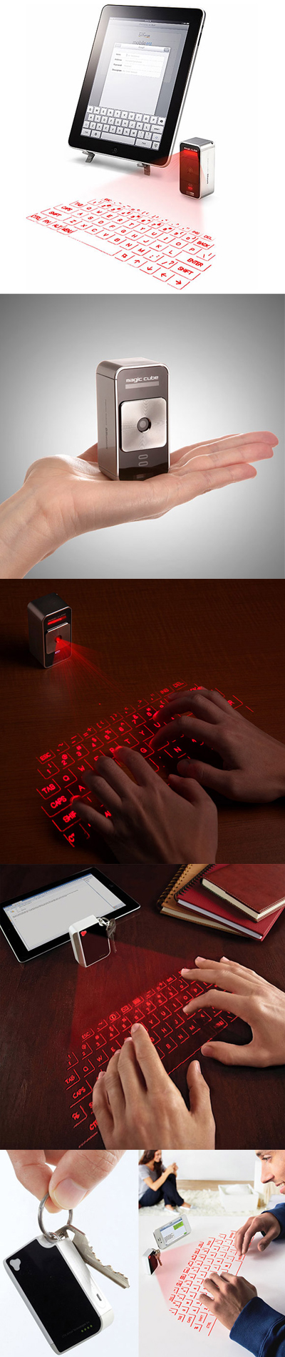 Eccovi il Cube Laser che crea una tastiera virtuale per il vostro iPad o iPhone. Si chiama Magic Cube e la sua batteria dura per 150 minuti. Prezzo: 179.99 $.