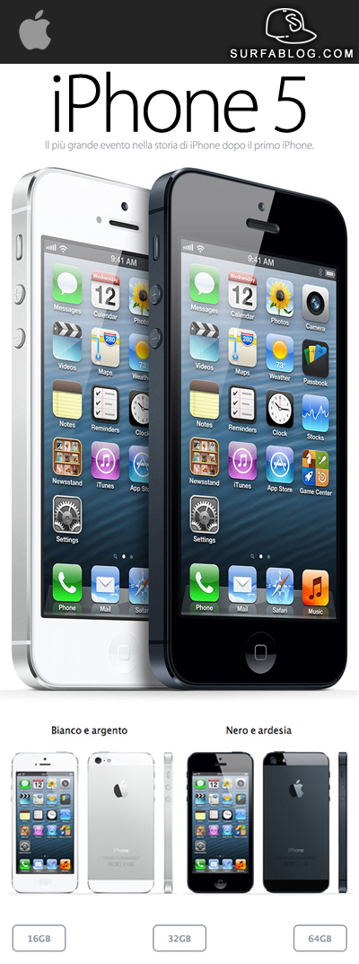 "Per creare un design mai visto prima abbiamo creato tecnologie mai viste prima" ed eccovi quindi il nuovo telefono con una profondità di 7,6 mm ed un peso di 112 grammi. Per renderlo più sottile, Apple ha dovuto pensare in piccolo, componente per componente: è stata creata la nano-SIM (il 44% più compatta di una micro-SIM) ed il connettore Lightning più piccolo dell'80% rispetto a quello precedente. La fotocamera iSight è più piccola del 20% ma è da 8MP, capace di scattare foto in formato panorama regolando la luminosità da sè. La fotocamera anteriore è una FaceTime HD camera che registra video in 720p con tanto di retroilluminazione e face detection. Il nuovo chip A6 è il doppio più veloce rispetto all'A5 nonostante sia il 22% più piccolo. Pur possedendo tutte queste innovazioni l'iPhone 5 è il 18% più sottile e il 20% più leggero dell'iPhone 4. Anche il display è più sottile ed è il primo display Retina con tecnologia touch integrata. Il display è da 4 pollici in formato 16:9 con una risoluzione pari a 1136 x 640 con i colori che risultano per il 44% più saturati. In questo modo si possono aggiungere fino a 5 icone in verticale e di visualizzare video in wildscreen. l'iPhone 5 supporta le reti HSPA+, DC-HSDPA e LTE che consentiranno di migliorare notevolmente la velocità di caricamento delle pagine, migliorando anche il wi-fi e la velocità di caricamento dei dati su rete fissa. La nuova batteria dura 8 ore in conversazione 3G, 8 ore in navigazione ed 8 ore in navigazione LTE. Con il wi-fi e con video in riproduzione dura 10 ore. Ha 40 ore di autonomia e per la riproduzione musicale ha 225 ore in standby. L'iPhone 5 ha 3 nuovi microfoni: in basso, in alto e sul retro e servono per il wideband audio, per la cancellazione del suono e per le chiamate. Sarà disponibile in Italia dal 28 Settembre come il 4S in 2 tonalità: nero e bianco ed i prezzi devono essere ancora annunciati.