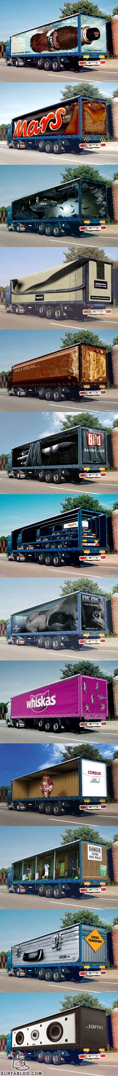 Eccovi la nuova frontiera della pubblicità: dei maxi camion con delle grafiche in 3 dimensioni per attirare l'attenzione degli automobilisti. Attualmente sono solo dei concept che però sono in procinto di essere prodotti.