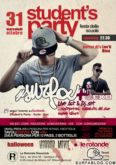 Eccovi il flyer ed il video promo per la notte di Halloween. Infatti Mercoledì 31 Ottobre io ed Exo faremo un dj set alle Rotonde Club di Garlasco (Pavia) per lo "Student Party - Halloween Horror Movie Vol.1". E' il party in collaborazione con gli istituti superiori di Vigevano e Mortara con un dress code in puro stile horror, zombie e splatter. In anteprima presenteremo un brano del nuovo disco!