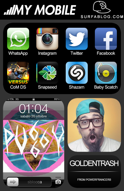 Eccovi il post numero 2 di My Mobile, la nuova categoria del SURFAblog, in cui si vedono le 8 applicazioni più usate/preferite e lo sfondo del telefono di ogni personaggio. Oggi troviamo Goldentrash dei Power Francers.
