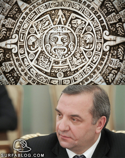 In Russia numerose persone credono fermamente che la fine del mondo sarà il 21 Dicembre 2012, quando terminerà il ciclo di 5.125 anni previsto dal calendario Maya. Per questo motivo in molti non reggono la pressione, rendendo necessario l'intervento di psicologi e sacerdoti. Per questa ragione le autorità russe, spaventate dalla reazione dei cittadini, hanno cercato di riportare la calma con questa dichiarazione del ministro della protezione civile, Vladimir Puchkov (nell'immagine) "Noi lo sappiamo! Non ci sarà assolutamente nessuna apocalisse. Le catastrofi globali avvengono una volta ogni 10/15 milioni di anni e gli ultimi cataclismi seri sono successi alcune centinaia di anni fa".
