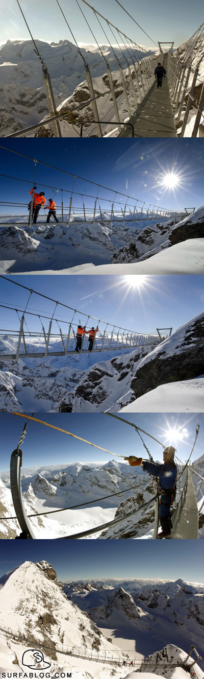 Si chiama Titlis, si trova in Svizzera ed è il ponte sospeso più alto d'Europa. Verrà inaugurato il 7 Dicembre ed è situato a 3.041 metri, è lungo 100 e promette visioni incantevoli sulle Alpi, sulla Valle del Reno e sul ghiacciaio sottostante.