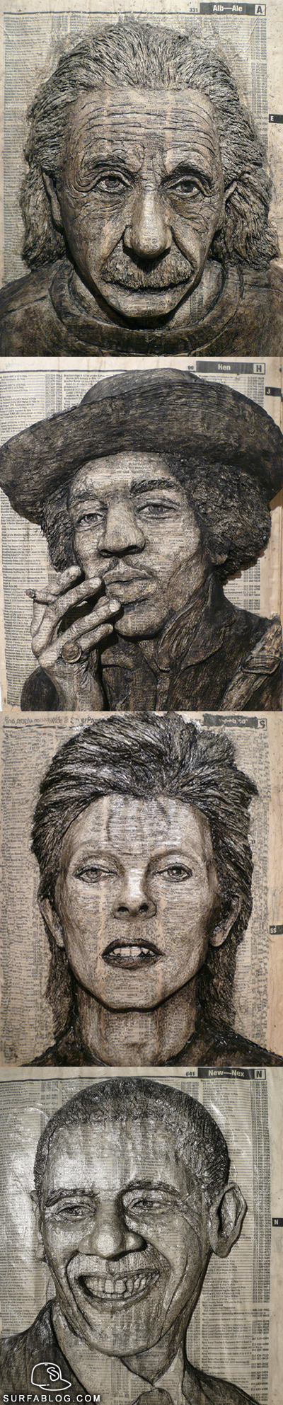 Dopo i Carved Books (per saperne di più clicca qui), e le sculture con i libri (per saperne di più clicca qui), eccovi oggi le opere realizzate da Alex Queral chiamate "Phone Book Art". L'artista dell'Havana, ha dato un senso a vecchi elenchi telefonici (da qui il nome della raccolta), componendo delle sculture che trasformavano l'elenco, in un volto di un personaggio famoso. In ordine: Albert Einstein, Jimi Hendrix, David Bowie e Barack Obama! Wow!