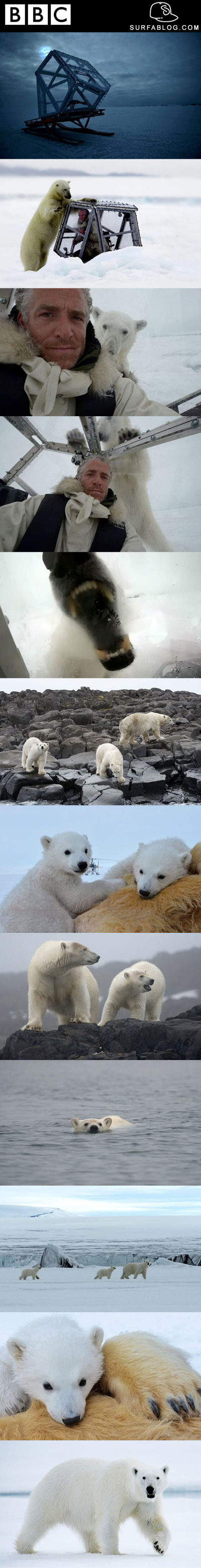 Il cameraman Gordon Buchanan di BBC, era nella zona settentrionale della Norvegia per realizzare delle foto agli orsi polari ed al paesaggio. Si trovava al sicuro nella sua "perspex pox" che è l'equivalente di una gabbia di protezione per gli squali. L'uomo è stato poi attaccato (senza subire danni), per 45 minuti da un'orsa affamata. Eccovi le sue fantastiche foto!