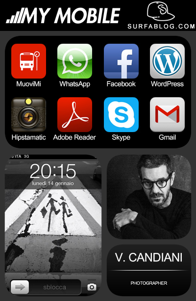 Eccovi il post numero 18 di My Mobile, la nuova categoria del SURFAblog, in cui si vedono le 8 applicazioni più usate/preferite e lo sfondo del telefono di ogni personaggio. Oggi troviamo Valentino Candiani.