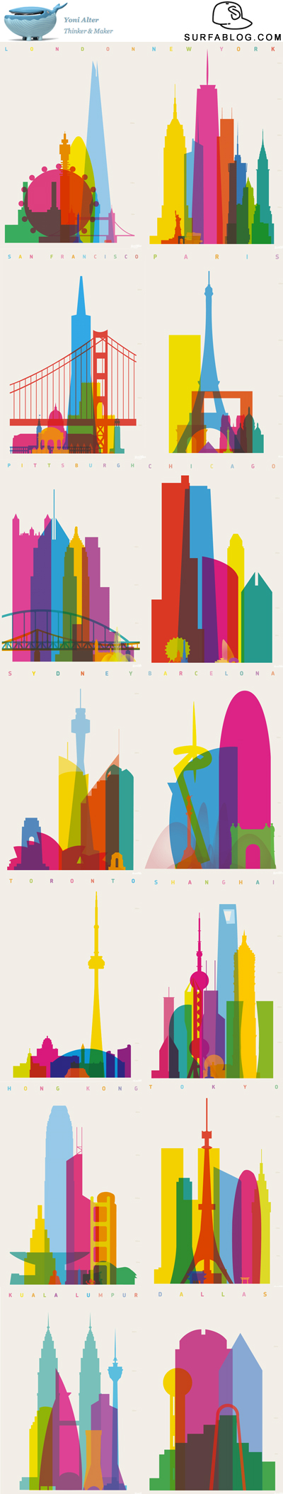 Yoni Alter ha realizzato queste opere per la collezione "Shapes Of Cities" ovvero le forme delle città. Ogni dipinto mostra i monumenti e le opere in scala della città in questione. In ordine: Londra, New York, San Francisco, Parigi, Pittsburgh, Chicago, Sidney, Barcellona, Toronto, Shanghai, Hong Kong, Tokyo, Kuala Lumpur, Dallas. Nice!
