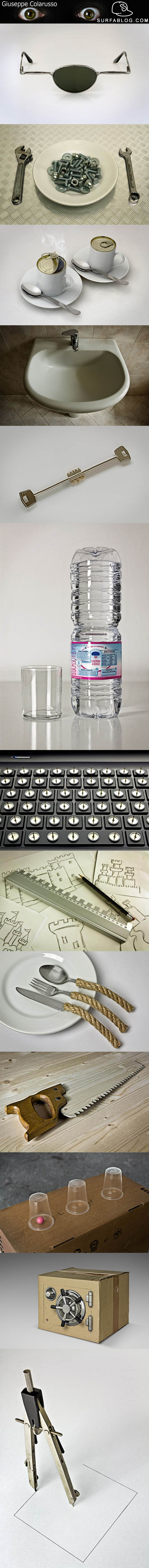 Giuseppe Colarusso ha realizzato queste opere che fanno parte della collezione "Improbability". L'artista italiano coniuga sapientemente una serie di oggetti improbabili tra di loro, i quali creano delle situazioni inverosimili ma divertenti! Nice!
