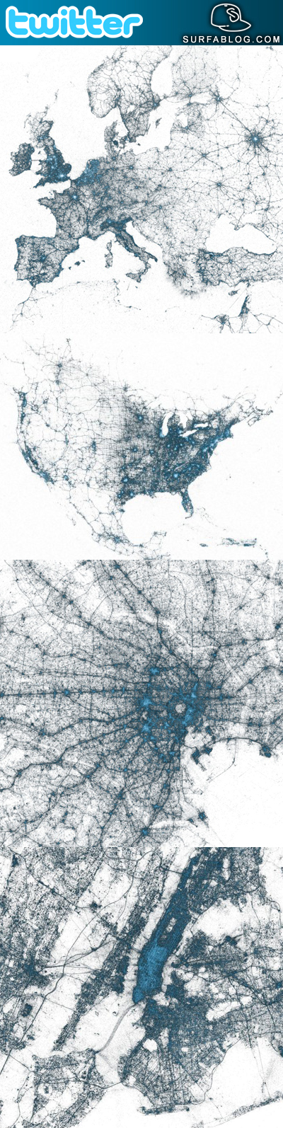 Eccovi la mappa del mondo fatta da miliardi di puntini, che sarebbero i tweet geolocalizzati (ovvero quelli in cui l'utente decide di far sapere la sua posizione in cui scrive). Il team Visual Insight ha analizzato tutti quei file dal 2009 ad oggi, realizzando la mappa con le zone del mondo in cui si usa di più il sito di microblogging. Si nota subito una massima concentrazione nei centri urbani e lungo le vie di comunicazione (come il ponte di San Francisco); città come New York e Sidney cinguettano continuamente ma le città dove c'è più flusso sono Tokyo, Londra, Mosca e Boston. In Italia, ovviamente le città con più traffico sono Milano e Roma. Questo genere di mappe, non appagano solo la nostra curiosità, ma i servizi di geolocalizzazione e di microblogging, possono avere utilizzi sociali ed economici enormi.