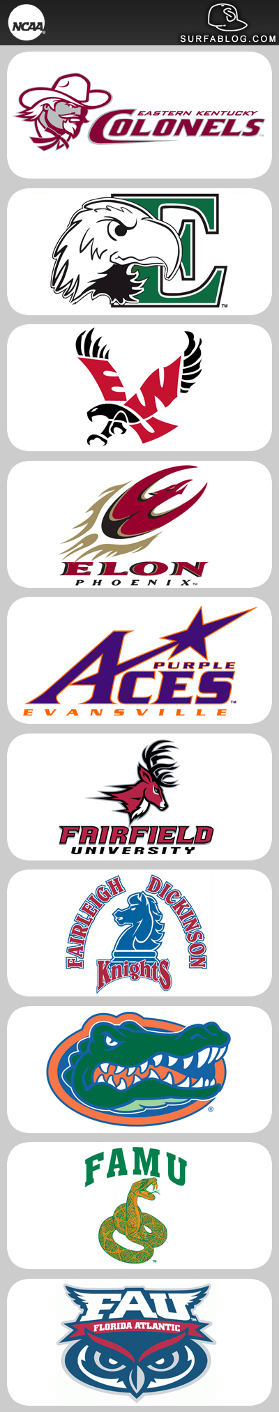 NCAA: è la sigla che sta per National Collegiate Athletic Association, ovvero un'associazione che raggruppa circa 1.200 istituti suddivisi in conference, che organizza programmi sportivi di college ed università degli Stati Uniti. L'NCAA nacque nel 1910 e gestisce 40 campionati sportivi. Ogni settimana dedicherò un post con 10 squadre di questa lega. Oggi il quarto post con: Eastern Kentucky Colonels; Eastern Michigan Eagles; Eastern Washington Eagles; Elon Phoenix; Evansville Purple Aces; Fairfield Stags; Fairleigh Dickinson Knights; Florida Gators; Florida A&M Rattlers; Florida Atlantic Owls.