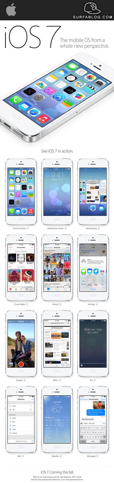 clicca qui). iOS 7 è considerato il più grande aggiornamento di iOS dall'introduzione del primo iPhone. Ogni applicazione è stata ridisegnata e la sua interfaccia è anche in 3D e sensibile al movimento, risultando più dinamica e fresca. Le app ruoteranno a seconda di come si muove lo smartphone e grazie alla gestione della priorità dei processi, le applicazioni più usate avranno la precedenza rispetto alle altre. Il centro notifiche è con uno sfondo sfumato e le icone appaiono più semplici e vivaci rispetto a prima. In iOS 7 c'è l'introduzione di un nuovo menu, che comparirà scorrendo dal basso verso l'alto sullo schermo; si tratta del Control Center, con cui si gestiranno rapidamente le impostazioni del dispositivo: selezionare il livello di luminosità, interagire con i Media controls, usare l'AirPlay ed accedere alle app. Anche Safari ha cambiato volto, in linea con il nuovo sistema operativo. Un'altra novità è l'introduzione dell'AirDrop, utile per lo scambio dati tra 2 smartphone, anche se sarà disponibile solo su iPhone 5 e iPad di quarta generazione. Anche Siri è stato migliorato e sarà con una nuova grafica, con delle nuove opzioni e delle nuove voci. L'applicazione Musica è stata rivista e al suo interno sarà disponibile la iTunes Radio, che consentirà di ascoltare musica tramite internet in modo totalmente gratuito. iOS 7 sarà disponibile per iPhone 4, iPhone 4S, iPhone 5, iPod touch di quinta generazione, iPad 2, iPad di terza e quarta generazione, iPad mini. iOS 7 sarà disponibile in autunno.