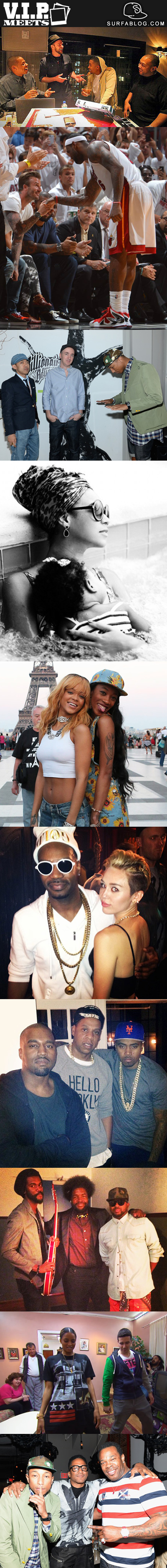 Nuovo VIP Meets oggi! Nella prima foto: Jay-Z, Justin Timberlake, Nas e Timbaland in studio. Nella seconda: David Bekham e LeBron James prima di gara 7 contro i Pacers. Nella terza: Nigo, Kaws e Pharrell per il decimo anniversario di BBC. Nella quarta: Beyoncè e Blue Ivy si godono un idromassaggio. Nella quinta: Rihanna e Melissa Forde davanti alla Torre Eiffel. Nella sesta: Juicy J e Miley Cyrus a Los Angeles. Nella settima: Kanye West festeggia il suo compleanno a New York con Jay-Z e Nas. Nell'ottava: Clark Jr. ?uestlove e The Dream al Late Night Show. Nella nona: Ciara insegna a ballare a Vinny insieme ai genitori di quest'ultimo per il "The Show with Vinny". Per concludere: Pharrell, Q-Tip e Busta Rhymes per il decimo anniversario di BBC.