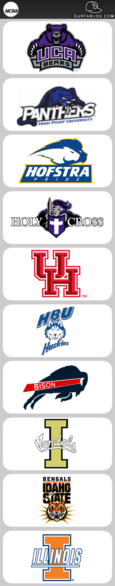 NCAA: è la sigla che sta per National Collegiate Athletic Association, ovvero un'associazione che raggruppa circa 1.200 istituti suddivisi in conference, che organizza programmi sportivi di college ed università degli Stati Uniti. L'NCAA nacque nel 1910 e gestisce 40 campionati sportivi. Ogni settimana dedicherò un post con 10 squadre di questa lega. Oggi il nuovo post con: Central Arkansas Bears, High Point Panthers, Hofstra Pride, Holy Cross Crusaders, Houston Cougars, Houston Baptist Huskies, Howard Bison, Idaho Vandals, Idaho State Bengals, Illionis Fighting Illini.