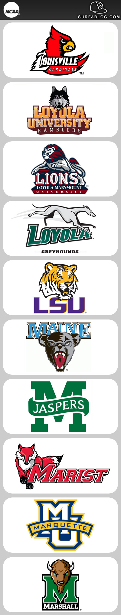NCAA: è la sigla che sta per National Collegiate Athletic Association, ovvero un'associazione che raggruppa circa 1.200 istituti suddivisi in conference, che organizza programmi sportivi di college ed università degli Stati Uniti. L'NCAA nacque nel 1910 e gestisce 40 campionati sportivi. Ogni settimana dedicherò un post con 10 squadre di questa lega. Oggi il nuovo post con: Louisville Cardinals, Loyola Ramblers, Loyola Marymount Lions, Loyola-Maryland Greyhounds, LSU Tigers, Maine Black Bears, Manhattan Jaspers, Marist Red Foxes, Marquetta Golden Eagles, Marshall Thundering Herd.