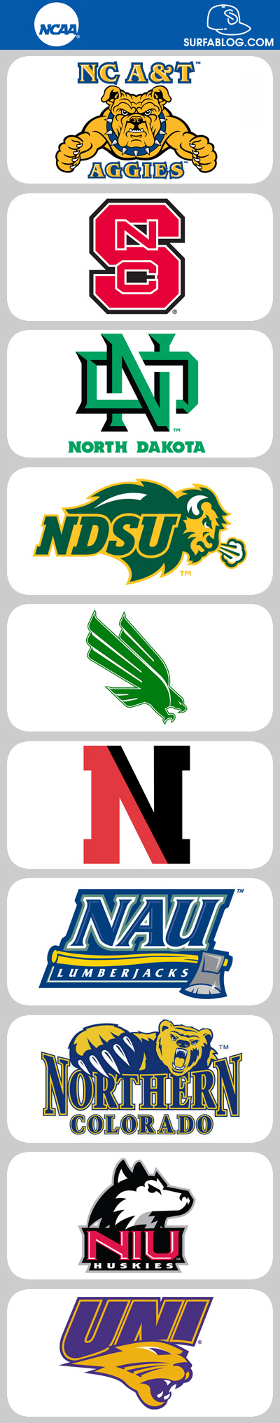 Oggi il nuovo post con: North Carolina A&T Aggies; North Carolina State Wolfpack; North Dakota Fighting Sioux; North Dakota State Bison; North Texas Mean Green; Northeastern Huskies; Northern Arizona Lumberjacks; Northern Colorado Bears; Northern Illinois Huskies; Northern Iowa Panthers.