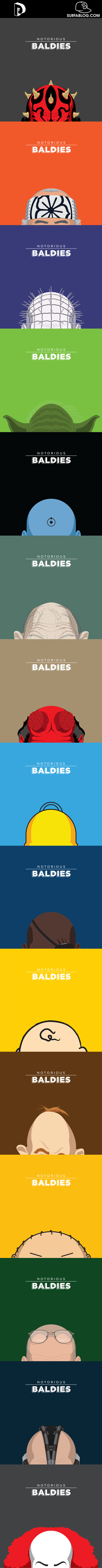 Eccovi, in ordine, 15 illustrazioni dell'artista: Darth Maul (Star Wars), Mr. Miyagi (Karate Kid), Pinhead (Hellraiser), Yoda (Star Wars), Dr. Manhattan (Watchmen), Gollum (Lord Of The Rings), Hellboy (Hellboy), Homer Simpson (The Simpsons), Nick Fury (The Avengers), Charlie Brown (Peanuts), Lotney Sloth Fratelli (The Goonies), Stewie Griffin (Family Guy), Walter White (Breaking Bad), Bane (The Dark Knight Rises), Pennywise (It).