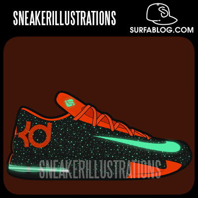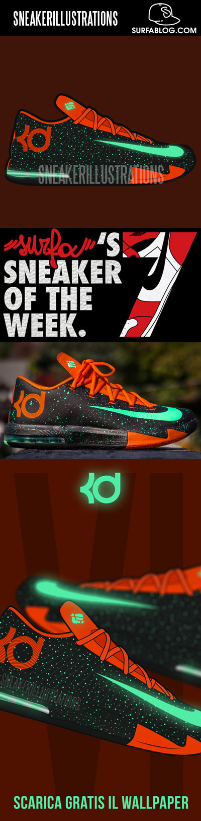 Questa volta l'attenzione del web si è focalizzata sulla KD VI Texas, che è la terza KD VI ad essere eletta scarpa della settimana (per saperne di più clicca qui e clicca qui). La sneaker è stata realizzata come tributo all'University of Texas ad Austin, college in cui ha giocato KD, chiudendo con le cifre di 25,8 punti a gara e 11,1 rimbalzi. La colorazione è quella tipica dei Longhorns, squadra collegiale di Kevin, ed è composta da nero, arancione ed inserti glow in the dark. I colori inoltre richiamano quelli di Halloween, visto che ci avviciniamo al 31 Ottobre. La scarpa è disponibile dal 10 Ottobre al prezzo di 130 $. E non è un caso che al 35esimo appuntamento della SOTW ci sia proprio una sneaker di Kevin Durant.