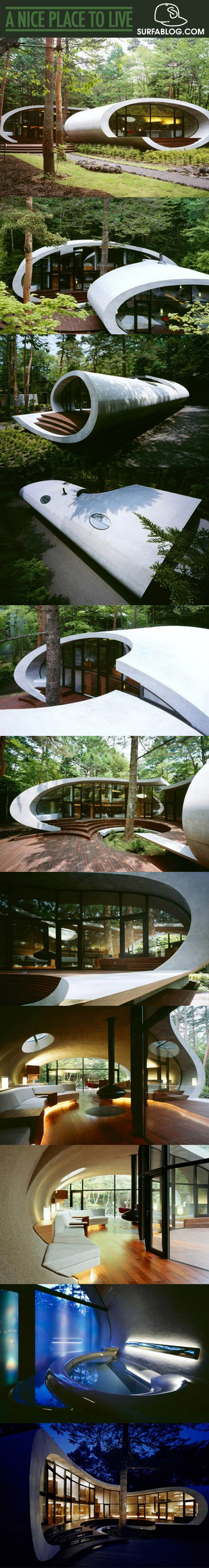 Ad idearla è il gruppo ARTechnic di cui vi avevo già parlato in passato, per saperne di più clicca qui. E' situata nel cuore di una foresta e fa da contrasto netto tra natura e cemento. La villa si fonde tra spazio esterno ed interno, con un design pulito e di avanguardia.