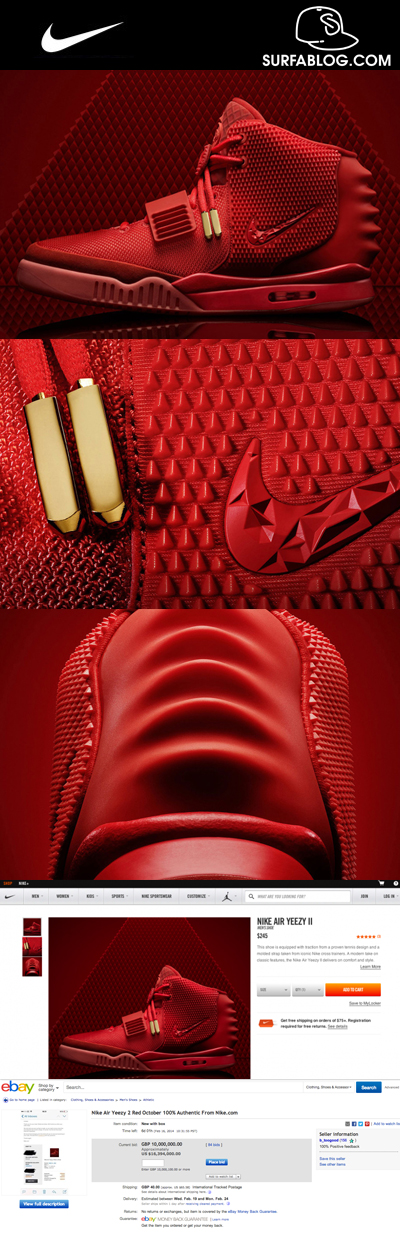 Le scarpe che erano in vendita alla cifra di 245 $ l’una, sono state terminate nel giro di 11 minuti. Ovviamente numerosi fan sono rimasti indispettiti per la scelta del brand, che però così facendo non ha favorito nessun compratore. Alcune Yeezy 2 “Red October”, sono state già messe in vendita su eBay con cifra che oscillano dai 3.000 agli 11.000 $. C’è poi un’inserzione che le ha messe a 16 milioni e 394 mila $.
