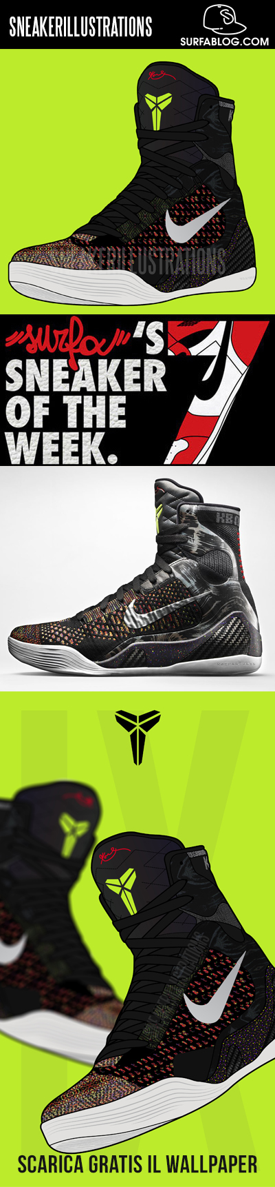 Il 6 Dicembre scorso, Nike ha presentato la nuova Kobe 9 Elite, una sneaker progettata dal brand che ha lavorato a stretto contatto con il giocatore. La scarpa, che è un mix tra innovazione tecnica, performance e stile, è stata presentata al Museum of Contemporary Art di Los Angeles. La tecnologia prevalente è la Flyknit ed i colori riflettono le ispirazioni di Bryant. La Kobe 9 Elite è in vendita dall’8 Febbraio al prezzo di 225 $.
