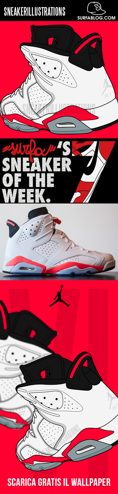 Per la prima volta tra le SOTW troviamo una Air Jordan VI, modello “White Infrared”, la sneaker che MJ ha indossato durante la stagione NBA 1990/91. La scarpa si ispira alla Porsche di Jordan ed è un’evoluzione della V, infatti ha la suola ed il ferma lacci molto simile. La parte superiore è molto alta e la linguetta presenta l’estremità in gomma con 2 fori che insieme all’aletta posteriore facilitano la calzatura della scarpa e la sua ergonomia. Un’altra innovazione è l’inserimento della dicitura “Air” intersecata con la parola “Jordan”, in questo modo “JO(A)R(I)D(R)AN”. La VI “White Infrared” era stata pubblicata nuovamente nel 2010 e quest’anno è stata rilanciata da Sabato 15 Febbraio. Stavolta il rosso “Infrared” è abbastanza tendente al rosa scuro. Prezzo 169 €.