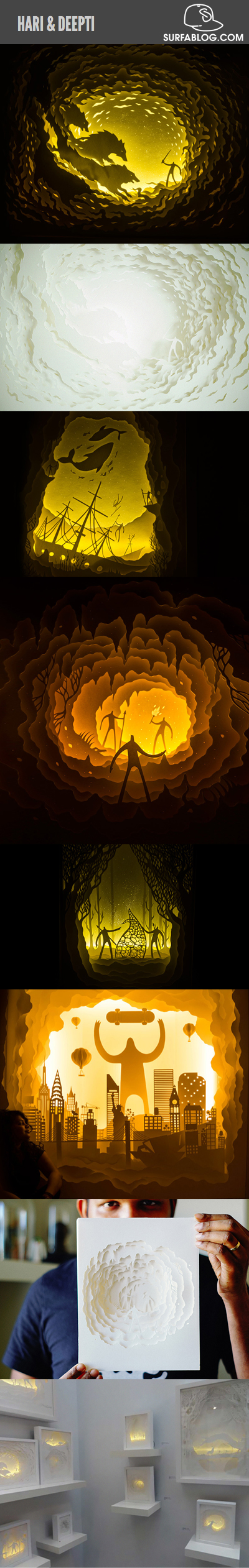 Si tratta di illustrazioni senza pennelli o colori, ma semplicemente retroilluminando a led vari strati di carta. Wow!