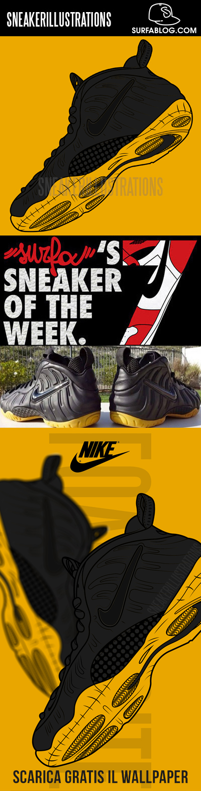 Questa volta l'attenzione del web si è focalizzata sulla Foamposite Pro “Final Adoption”, che è il terzo modello di questa sneaker ad essere inserito tra le SOTW oltre alla “Foamposite One Phoenix Suns” (per saperne di più clicca qui) ed alla “Foamposite Pro “Red/Black/Blue” (per saperne di più clicca qui). La “Final Adoption” è interamente nera opaca con la suola gialla. Questo è un modello che Nike sta riproponendo in varie colorazioni ed infatti nell'ultimo periodo le due più celebri sono state la Weatherman e la Thermal Map. Attualmente non è stata comunicata nè la data d'uscita nè il prezzo della sneaker, ma verrà rilasciato a breve dal brand.