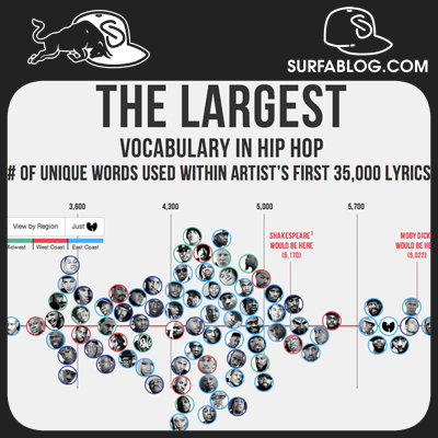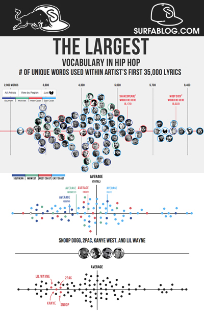 L’élite letteraria ama analizzare il vocabolario di Shakespeare, considerato come il poeta con il vocabolario più ampio di tutti con un totale di 100.000 parole utilizzate nelle sue opere, di cui 28.829 quelle più comuni. Matt ha quindi confrontato questi dati con quelli dei più celebri artisti Hip-Hop, analizzando oltre 35.000 parole di ogni artista, in modo da paragonare quelli più longevi come Jay-Z a quelli più nuovi come Drake. Secondo Matt, 35.000 parole sono quelle necessarie per una media di tre o cinque album, e nella sua ricerca ha incluso anche quelli presenti in mixtape ed EP per i rapper meno famosi. Come valore di riferimento ha inserito i dati di Shakespeare e di Herman Melville con il medesimo approccio: 35.000 parole per le opere del primo e 35.000 per quelle di “Moby Dick”. Ogni parola viene conteggiata una sola volta, in modo che parole come “pimps”, “pimp”, pimping”, “pimpin” sono quattro parole uniche. Per evitare problemi con gli apostrofi (ad esempio “pimpin” e “pimpin’”), queste sono state rimosse dal dataset. Gli artisti con il vocabolario più ampio sono 85 e sono stati anche evidenziati con colori diversi in base alla loro provenienza: Southern (blu scuro), Midwest (verde), West Coast (rosso) e East Coast (celeste).