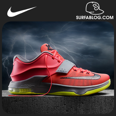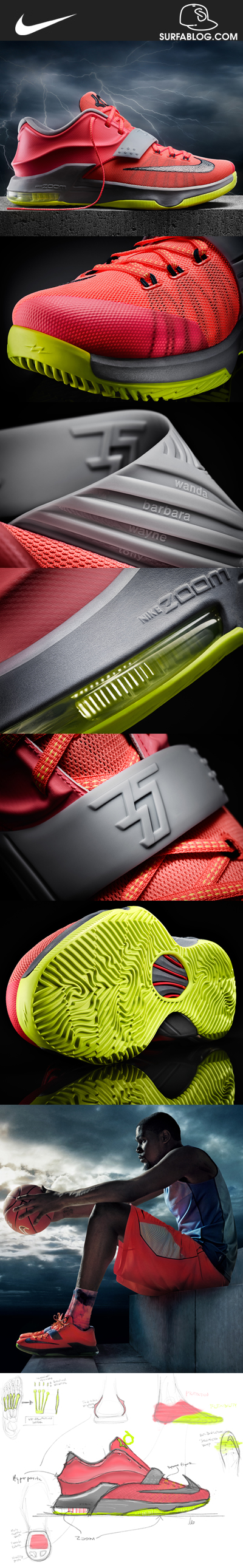 Nike ha introdotto il settimo modello firmato per Durant in questo modo “La leggenda narra che un fulmine non colpisce mai 2 volte nello stesso punto, eppure questa regola non vale per Kevin Durant, il quale segna da ogni dove sul campo”. La KD7 unisce le migliori innovazioni e prestazioni, con la colorazione che si ispira alla meteorologia, una delle passioni di Durant sin da bambino. La KD7 è stata realizzata dal giocatore insieme a Leo Chang, il quale ha impiegato 18 mesi per dare vita al progetto creativo. La KD6 è stata ideata dallo stesso designer ed ha avuto un successo globale sia in quanto alle vendite, che in quanto alle prestazioni della stella di OKC (MVP e una media di 32 punti a partita nella scorsa stagione indossando quel modello). L’obbiettivo di Chang per la KD7 è stato quello di fornire a Durant la massima rapidità e flessibilità nell’avampiede, combinati alla stabilità ed al supporto per aver maggior potenza. Per riuscire nell’opera Leo ha utilizzato: la tecnologia Nike Flywire, Nike Zoom, Nike Zoom Air e Hyperposite. Quest’ultima fa il suo debutto nella linea KD, fornendo alla sneaker il supporto necessario per saltare e per i rimbalzi. Visto che Durant da piccolo voleva essere un meteorologo, la KD7 si ispira al fumine, che colpisce la terra con una temperatura media di 35.000 gradi Fahrenheit. Da qui il nome della sneakers “KD7 35.000 Degrees” e 2 parallelismi di Nike: il primo riguarda il 35, numero di maglia del giocatore e poi il fulmine, che è sinonimo della velocità delle sue azioni. La cinghia, fortemente voluta da KD, ed un’innovazione presente per la prima volta in un modello dedicato a lui, include i nomi: Wanda, Barbara, Wayne e Tony, rispettivamente sua madra, sua nonna, suo padre e suo fratello. I colori della KD7 “35.000 Degrees” sono: suola giallo fluo, cinghia e logo grigi e tomaia rosso ghianchio. Sarà disponibile su Nike.Com dal 26 Giugno ed in tutto il mondo dal 4 Luglio.