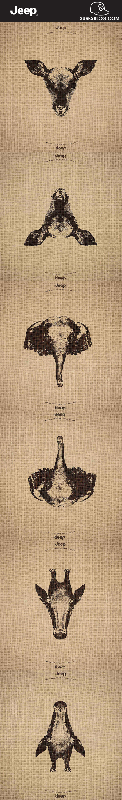 Infatti i 3 annunci, possono valere doppio, perchè se capovolti mostrano un’altra immagine. La campagna è stata ideata da Lee Burnett e lo slogan è il seguente “Vedi quello che vuoi vedere”. Lee ha commentato così “Quando sei un orgoglioso proprietario di una jeep, sappiamo che in qualsiasi momento puoi andare dove vuoi e vedere quello che vuoi vedere. Queste 3 illustrazioni mostrano la testa di un cerbiatto che diventa una foca, la testa di un elefante che diventa un’oca ed infine la testa di una giraffa che diventa un pinguino”. Geni!