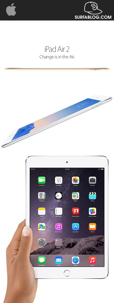 Misura infatti appena 6,1 mm ed è del 18% più sottile del modello precedente. Pesa 437 grammi ed è pensato per il trasporto. Il processore all’interno è un A7 con un coprocessore di movimento M7, che gli consente il 40% di velocità in più. Le dimensioni del display ed il numero dei pixel sono gli stessi del suo predecessore, ma la qualità dell’immagine è migliore grazie al sistema di costruzione. La fotocamera è come quella dei nuovi iPhone ed è da 8 megapixel, mentre la batteria consente 10 ore di autonomia con video, musica e navigazione. I prezzi oscillano a seconda dei vari modelli da 499 a 819 €.