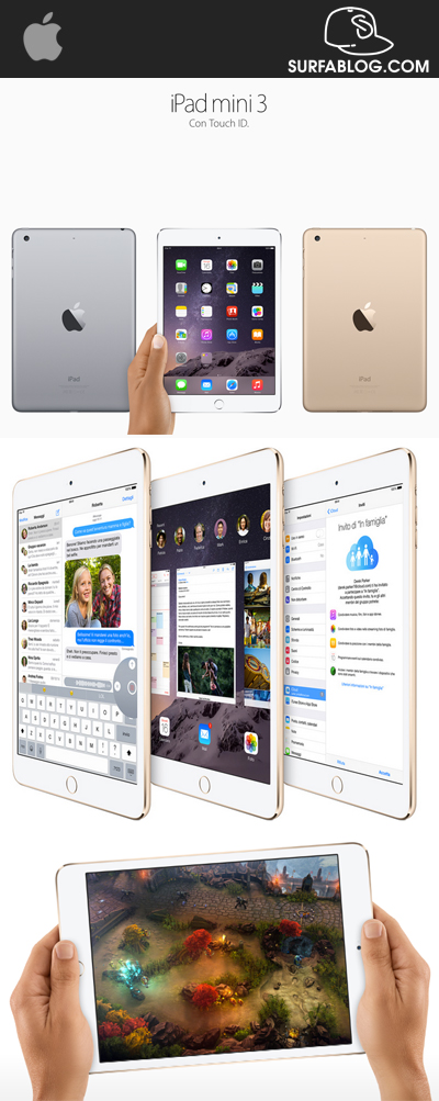 E’ stato progettato per essere piccolo, veloce e con capacità eccezionali. Il nuovo modello è con Touch ID, iOS 8 e la finitura color oro. Nonostante le sue dimensioni, l’iPad Mini 3 racchiude tutta la potenza del chip A7 con architettura a 64 bit di livello desktop, che dà performance straordinarie senza pesare sulla batteria. Con le nuove funzioni di iOS 8, come Panorama e Time-lapse, il nuovo iPad Mini ha tutto quel che serve per cogliere l’attimo e renderlo ancora più speciale. Possiede inoltre due antenne e la tecnologia MIMO per un Wi-Fi ancora più evoluto. Il suo prezzo parte da 399 €.