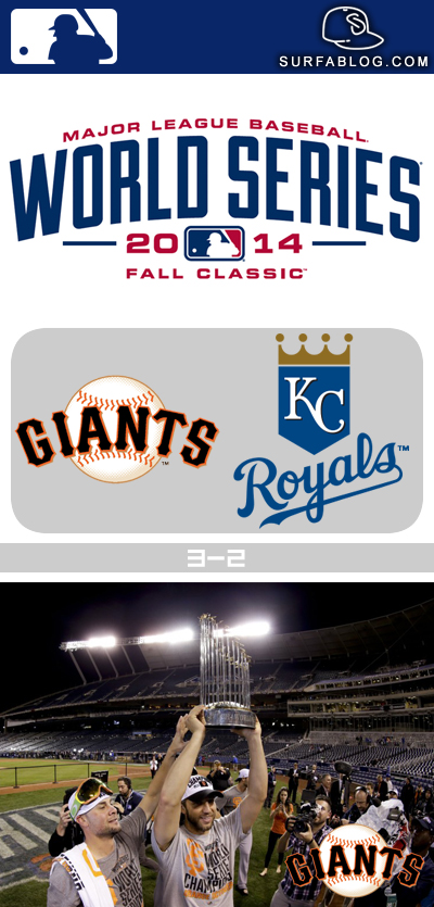 In gara-7, a casa di Kansas City, i Giants hanno battuto i Royals 3-2. Madison Bumgarner, a soli 25 anni è stato eletto MVP delle finali. Con questa vittoria i Giants hanno eguagliato i Boston, come squadra più vincente del nuovo secolo, portando ad 8 il loro totale.