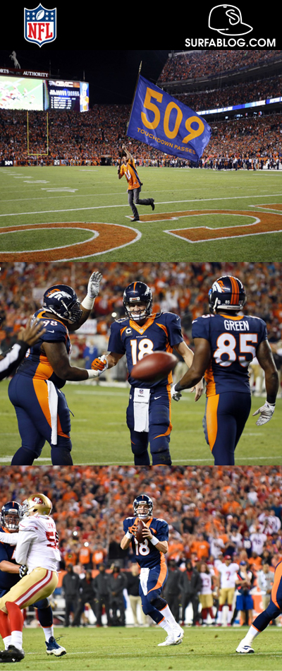 Manning è entrato nell’Olimpo dei quarterback realizzando il maggior numero di passaggi da touchdown di sempre: ben 509. PM ha commentato così “E’ un grandissimo onore per me. Apprezzo moltissimo tutti i quarterback che hanno giocato negli anni in NFL e ritengo un vero privilegio poter giocare in questo ruolo. C’è voluto tanto lavoro per arrivare sin qui e mi hanno aiutato davvero molte persone. Grazie”. Con 509 passaggi da touchdown, Manning ha superato Brett Favre ed ha chiuso il match a quota 510.