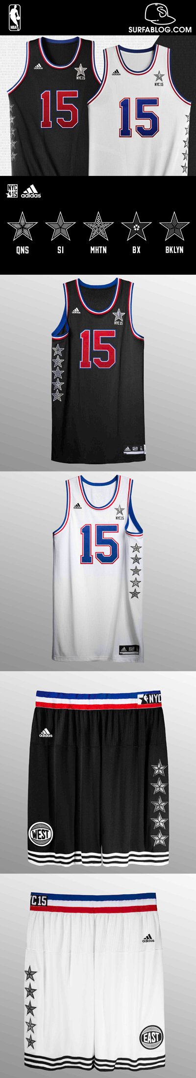 Le jersey contengono cinque stelle sul fianco, ognuna rappresentante uno dei cinque quartieri della Big Apple: Queens (con un motivo ispirato alle orbite in acciaio inossidabile dell’iconica Unisphere), Staten Island (con una fantasia ad onde a simboleggiare le acque che circondano il quartiere), Manhattan (con un pattern a scacchi ispirato ai taxi), Bronx (con una fantasia che richiama il disco in vinile, per rendere omaggio al luogo della nascita dell’Hip-Hop) e Brooklyn (con una fantasia a mattoni ispirata alle famose case ed edifici che compongono la zona). Le uniformi della Eastern Conference hanno i nomi neri ed i numeri blu, mentre quelle della Western hanno i nomi bianchi ed i numeri rossi. C’è il dettaglio a spina di pesce sulla patch East/West per rendere omaggio al Barclays Center, mentre il font dei Knicks è stato usato per i nomi ed i numeri dei giocatori. Per la prima volta in un All-Star Game, i nomi ed i cognomi dei giocatori sono entrambi presenti sul retro della canotta. Le divise saranno disponibili su NBAStore.Eu da Gennaio al prezzo di 85 €.
