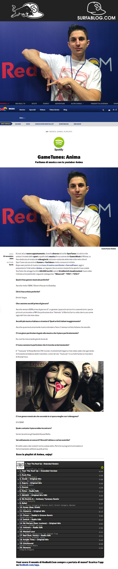Dopo aver parlato di musica con Luca, Il vostro caro Dexter e SurrealPower, oggi vi proponiamo l’intervista a Anima: un ragazzo che un anno e mezzo fa ha aperto il suo canale YouTube che ad oggi ha oltre 180.000 iscritti e più di 10 milioni di visualizzazioni. I suoi video trattano principalmente i seguenti videogames: “Minecraft”, “FIFA” e “GTA V”.