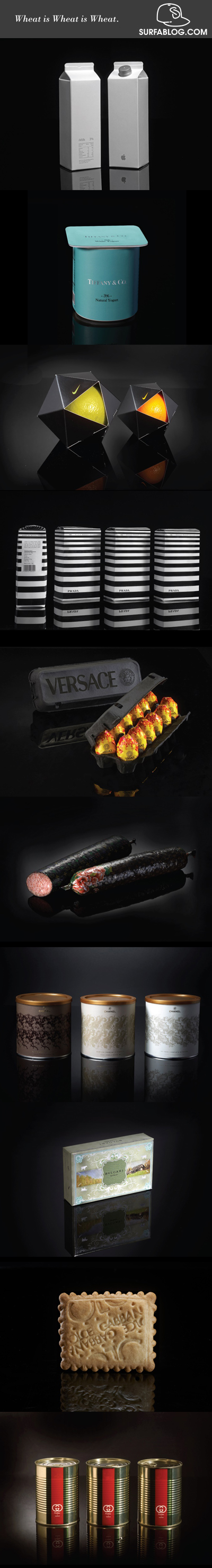 Il titolo della raccolta si chiama “Wheat Is Wheat Is Wheat”, che l’artista ha presentato così “Unendo il packaging dei più comuni prodotti di consumo con i valori del prestigio e del lusso, questa serie intende esplorare la dinamica e i confini etici del design all’interno della cultura del consumo. La raccolta sottolinea le sfide che un designer affronta quando è chiamato a promuovere gli interessi economici dei clienti, pur rimanendo fedele alla propria morale”. In ordine: il latte di Apple, lo yogurt di Tiffany, le arance di Nike, la farina di Prada, le uova di Versace, il salame di Louis Vuitton, il latte in polvere di Chanel, il burro di Bulgari, il biscotto di Dolce & Gabbana, i sottaceti di Gucci.