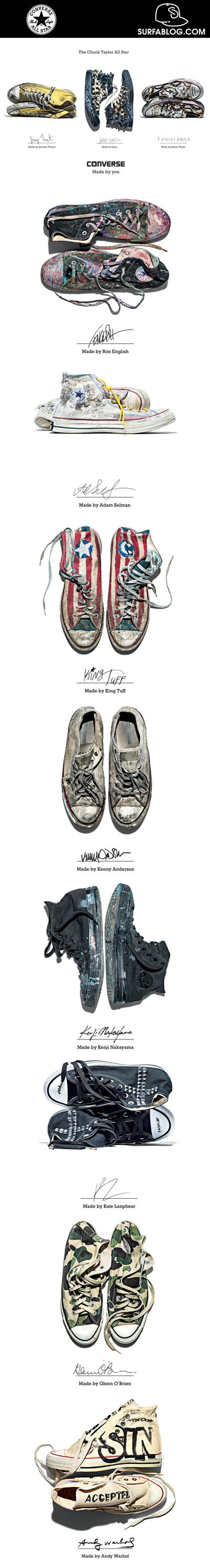 Nel mondo sono state vendute oltre 1 miliardo di paia di Chucks, ma queste di “Made By You” sono dei pezzi unici. La collezione comprende omaggi a creativi come: Andy Warhol, Futura, Ron English, Glenn O’Brien, Kate Lanphear ed altri. Le mostre saranno ospitate da città come: New York, Londra, Pechino e Città del Messico.