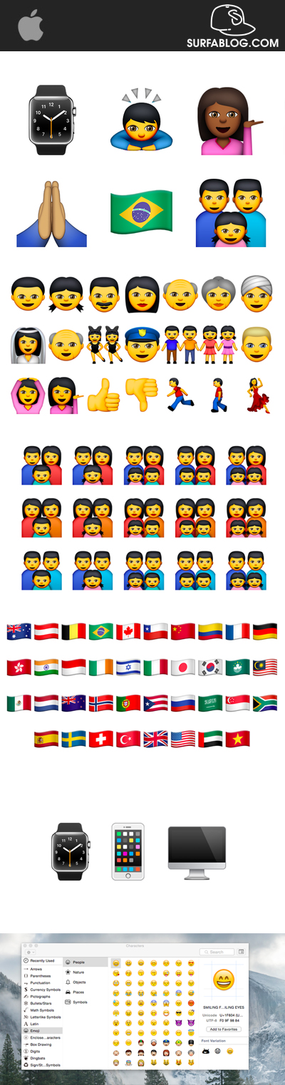 Oltre a quelle razziali (per saperne di più clicca qui), saranno presenti: le emoji gialle (colore generico per tutte le razze), nuove tipologie di famiglia, nuove bandiere e nuove immagini tecnologiche. Le emoji saranno raggruppate anche per gruppi e saranno presenti anche su OS X 10.10.3