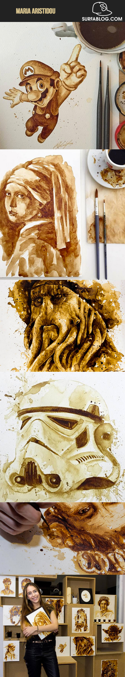Maria Aristidou è un’artista inglese che è diventata celebre sul web per aver realizzato delle splendide illustrazioni utilizzando due strumenti: caffè e pennello.