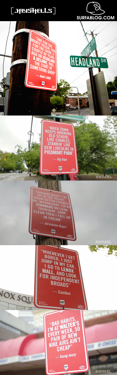 Rap Quotes è un progetto realizzato da da Jay Shells, che costruisce dei cartelli stradali di colore rosso, posizionati in precisi punti della città. Su ognuno di essi è scritta una citazione Rap (da qui il nome in inglese), che parla di quella precisa area in cui il segnale stradale è posizionato. Ad ATL, Jay ha creato cartelli dedicati a: Killer Mike, Bubba Sparxxx, Big Gipp, Jermaine Dupri, Canibus, Young Jeezy, T.I.,Khujo Goodie e Andre 3000. Per vedere il video clicca qui. Stupendo!