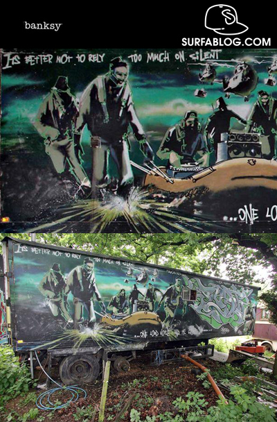 Il pezzo si chiama “Silent Majority” ed è stato realizzato a Glastonbury in Inghilterra nel 1998. L’artista lo fece chiedendo il permesso ad una coppia, proprietaria del rimorchio su cui ha dipinto l’artista. I due fortunati sono Maeve Neal e Nathan Welland ed hanno rimosso la parte di muro con il graffito di Banksy per metterlo all’asta e comprare una nuova casa sullo stesso terreno.