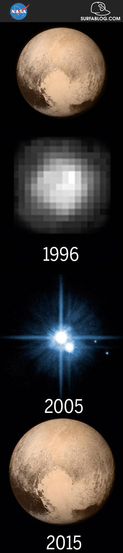 Dopo 9 anni e mezzo di viaggio e 5 miliardi di km percorsi, la sonda New Horizons ha raggiunto la sua destinazione. La sonda si trova ad una distanza tale, che il segnale impiega 4 ore e 25 minuti per raggiungere il nostro pianeta. Eccovi la prima immagine ufficiale di Plutone e l'evoluzione nel corso degli anni di come vedevamo il pianeta.