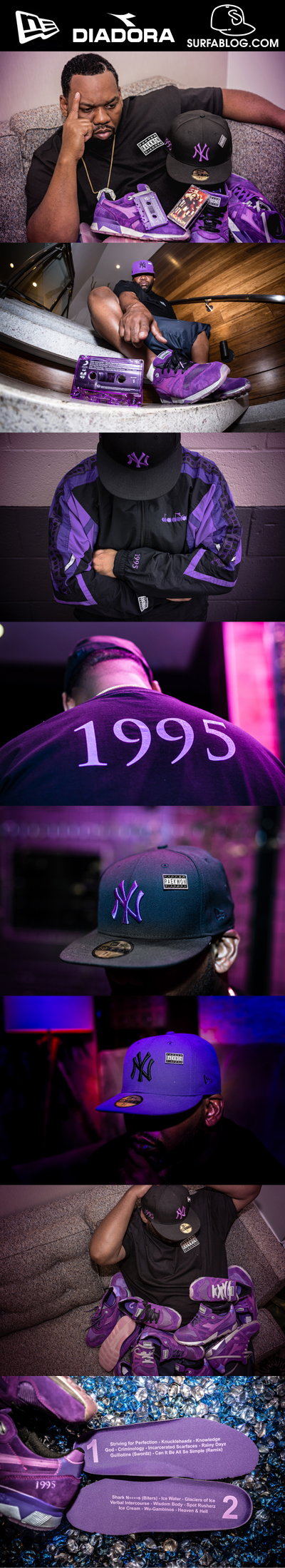 Si tratta di due cap 59Fifty, di una sneaker Diadora N.9000, una maglia ed una giacca per la collezione “Purple Tape”. La linea sarà in vendita dal 20 Agosto al SOBs di New York dalle 11 del mattino alle 6 del pomeriggio. I primi 95 clienti che acquisteranno le sneakers “Purple Tape”, riceveranno i biglietti per il concerto di Raekwon che festeggerà i 20 anni del suo album.