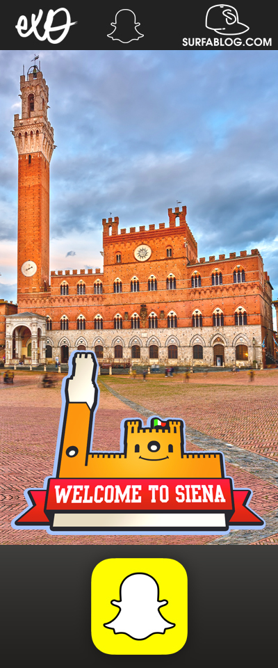 I geofiltri sono delle grafiche speciali che localizzano ed identificano i vostri snap. Ad esempio se vi trovate in una città come Milano, potete geolocalizzarvi e potrete scegliere il geofiltro di quella zona in cui siete. Snapchat sta spopolando anche in Italia, ed Exo ha realizzato per l’app, il geofiltro per “Siena”. Quando vi trovate lì e scattate una foto con questo filtro, mandatecela su Snapchat a: Alessioexo & Surfablog.