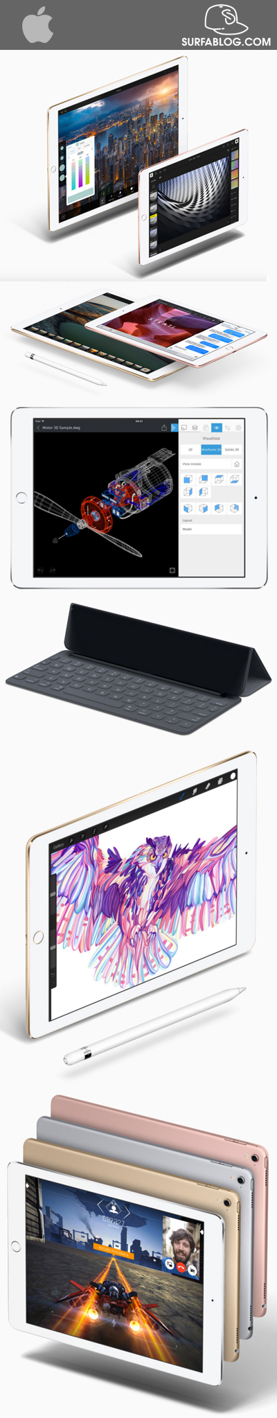 Rispetto al suo predecessore, che ha un display da 12,9’’ questo ne ha 3,2’’ in meno. L’hardware è sempre A9X con architettura a 64 bit. A presentarlo è stato Phil Schiller, responsabile del marketing, che l’ha definito un perfetto sostituto del personal computer. Ad esso può essere collegata la stilo, la tastiera smart ed un inedito adattatore USB che permette di collegare periferiche esterne.