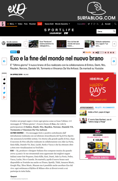 Un messaggio forte e positivo sottolineato dall’ introduzione realizzata con un’edizione straordinaria del Tg di Fox Sports che annuncia la terribile notizia. Un ritorno alla grande quello di Exo, dopo il successo di Fino alla fine realizzato in collaborazione con Jake La Furia, Emis Killa, Daniele Vit, Ensi, Luchè, Surfa e Vacca e che ha ottenuto oltre 2.600.000 visualizzazioni su YouTube .